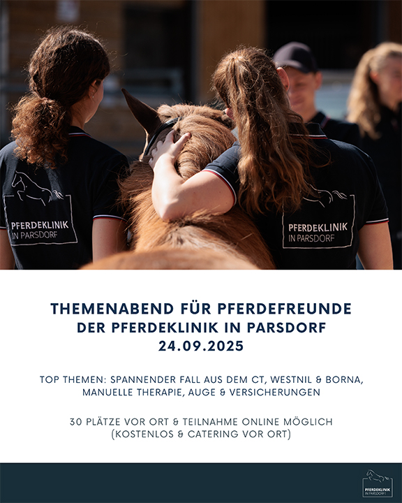 Am 24. September laden wir euch herzlich zu unserem nächsten Themenabend ein – vor Ort in Vaterstetten oder ganz bequem online. Euch erwarten spannende Vorträge rund um aktuelle Themen der Pferdemedizin: